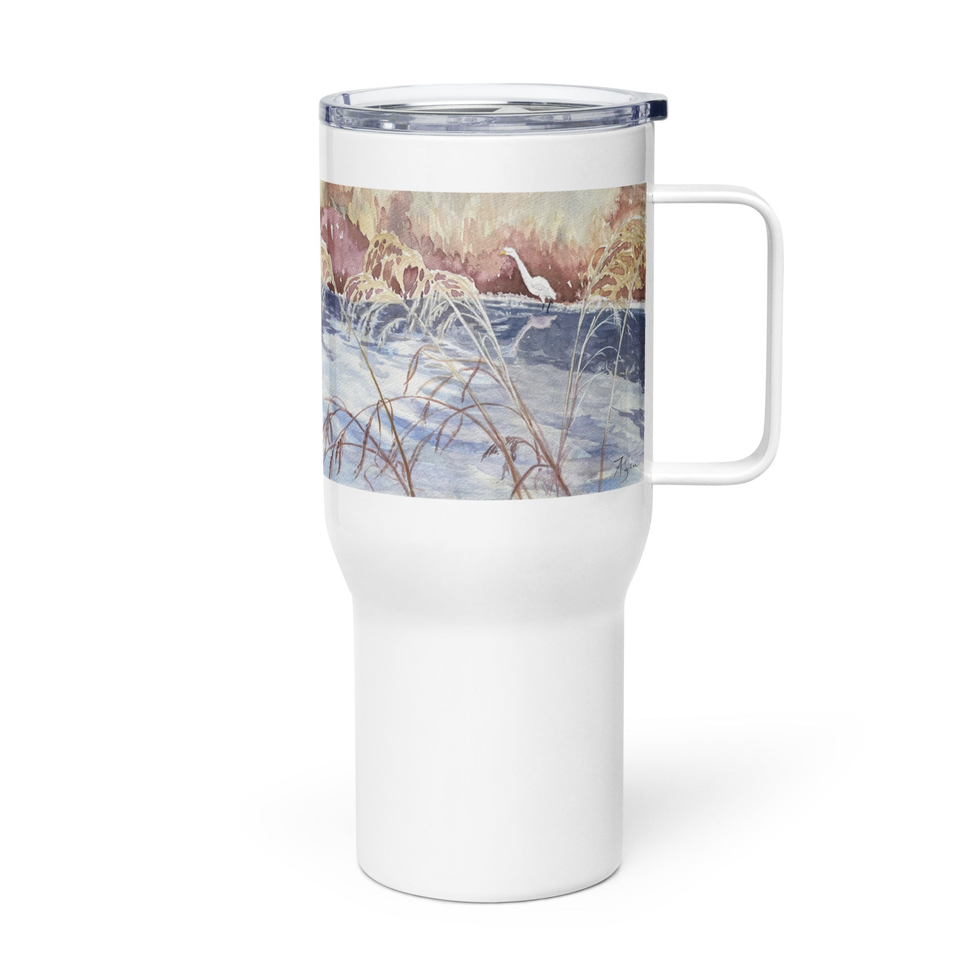 Shoreline Wetland with an Egret travel mug with a handle