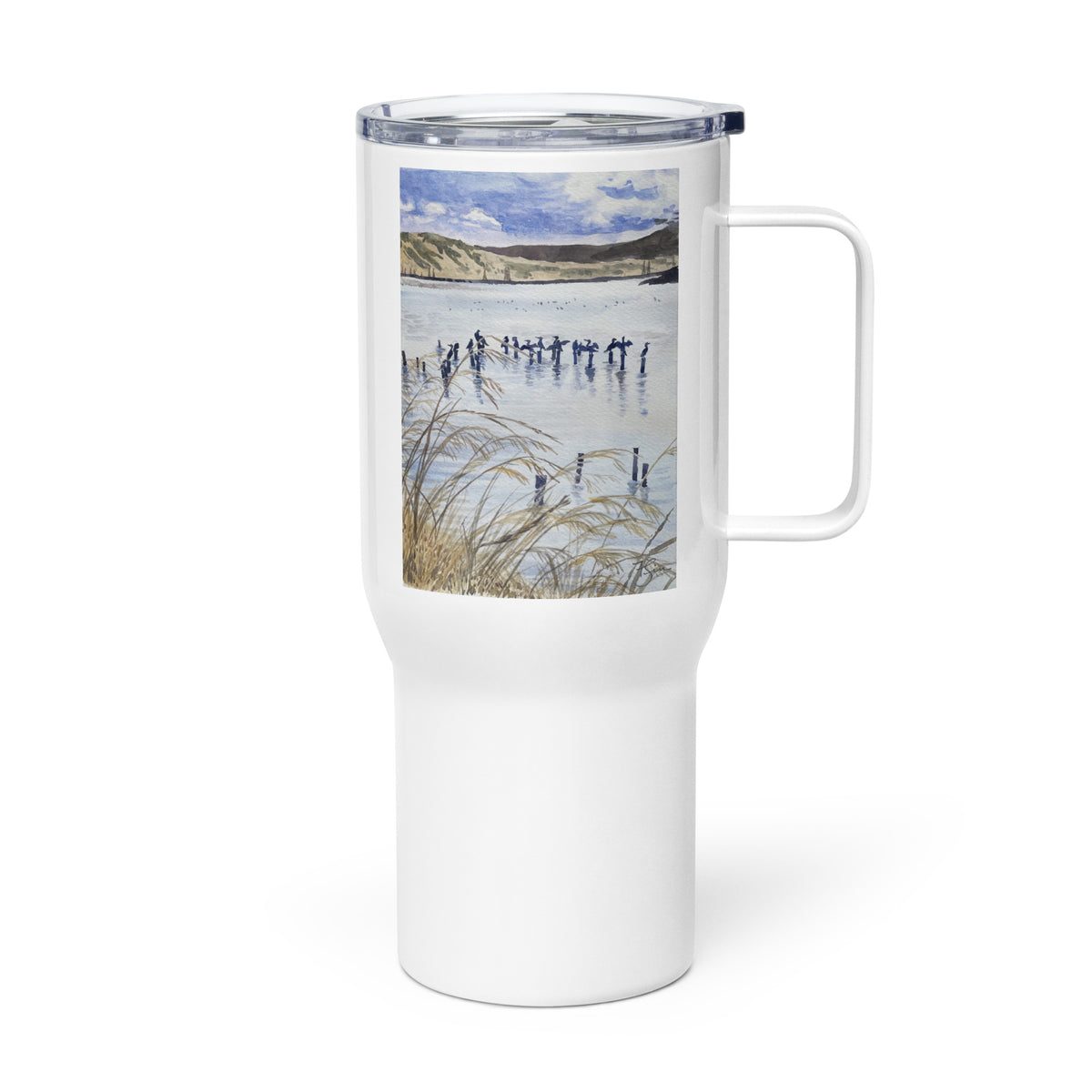 Shoreline Wetland with Cormorants travel mug with a handle